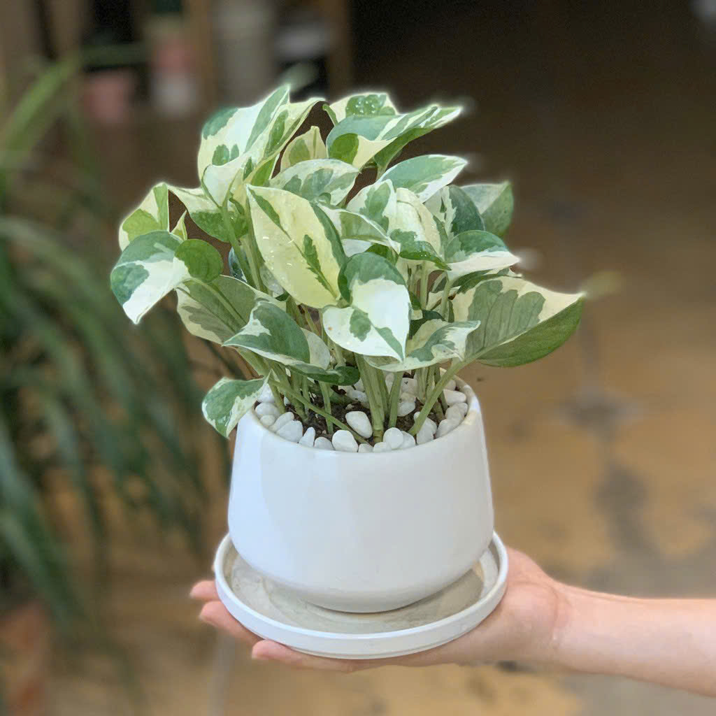 Cây Trầu Bà Cẩm Thạch là dòng cây cảnh nội thất được yêu thích bởi vẻ đẹp thanh lịch, hiện đại và rất dễ tạo điểm nhấn cho không gian. Phần lá của cây có sự pha trộn tự nhiên giữa xanh và trắng kem, tạo nên hiệu ứng loang cẩm thạch mềm mại, độc đáo và đầy tính thẩm mỹ.